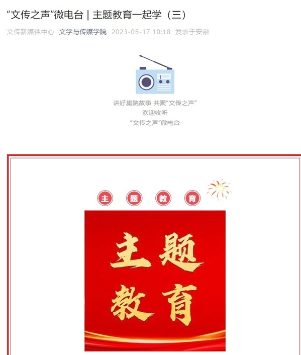 用好微电台,“声”入生心。文传学院始终致力于打造“文传之声”微电台,旨在讲好文传故事,弘扬红色文化,传递社会正能量。自主题教育开展以来,新媒体系学生党员学以致用、以学促干,截至目前共推出微电台播报主题教育学习六期,用青春之音传播好主题教育之“声”。