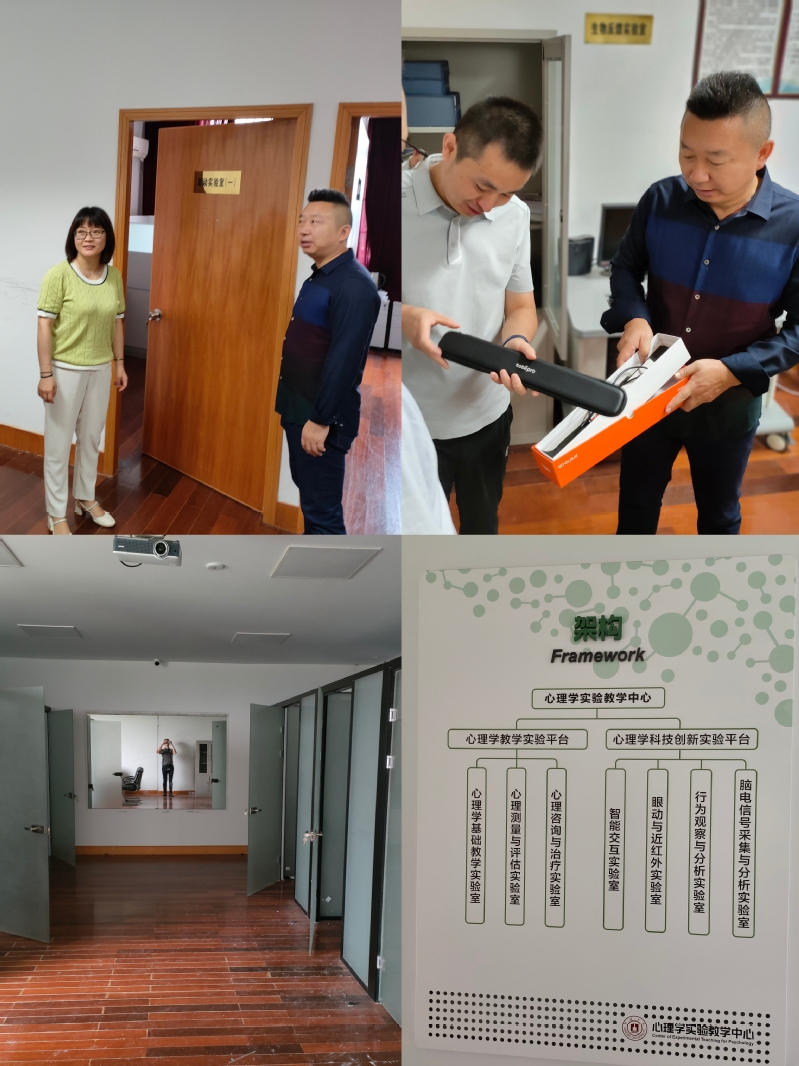 会后,大家参观了教师教育学院心理学实验教学中心,实验室面积约1500平方米,下设心理学教学实验平台和心理学科技创新实验平台,包含心理学基础教学实验室、心理测量与评估实验室、心理咨询与治疗实验室、智能交互实验室、眼动与近红外线实验室、行为观察与分析实验室、脑电信号采集与分析实验室等。参观过程中,李教授和袁博士对每个实验室的功能进行简单操作讲解。