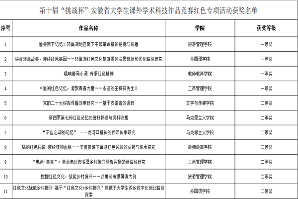 经省级评审,我校邓其志、马其霞等老师指导的《追寻南下记忆:环巢湖地区南下干部革命精神挖掘与传播》、李玲、余仁能等老师指导的《讲好环巢故事,赓续红色基因——环巢湖红色文化旅游景区发展现状和优化路径研究》、郭华、许沙等老师指导的《唱响唐马小调 传承红色精神》和李梦雨、储岚霖老师指导的《追溯红色记忆,凝聚青春力量——永远的王稼祥先生》4件作品荣获一等奖;袁凤琴、邵晓等老师指导的《党的二十大报告传播效果研究——基于安徽省的调研》、雷若欣、邓书音等老师指导的《挖掘红色文化,赋能乡村振兴——以巢湖市银屏镇为例》、邢刚、苏洁红等老师指导的《“红色摇篮,绿色家园”——学习革命老区经验,助力乡村光伏健康发展》、汤重老师指导的《唱响红色民歌赓续精神血脉——非遗视域下巢湖红色民歌的发展与传承探究》、王静、王海燕等老师指导的《“不应忘却的记忆”——龙河口精神的代际传承研究》等11件作品荣获二等奖;张凤琴、潘晨老师指导的《绿色发展背景下新时代大别山精神浅析》、刘政、梁哲铭等老师指导的《科技赋能,助力革命老区乡村振兴》、曹栓姐老师指导的《走进革命金寨,探寻红色记忆》等7件作品荣获三等奖。