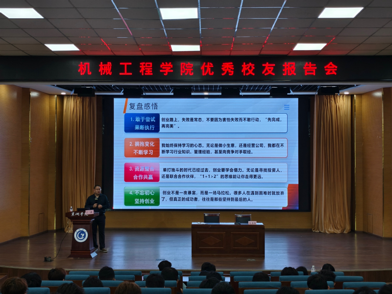 为发挥优秀校友的示范引领作用,激励广大学子奋发进取,4月24日,机械工程学院在求实楼报告厅举办优秀校友报告会。2017届校友、安徽邦创餐饮管理有限公司创始人肖健应邀来校做创业报告。来自全校200余名学生到场聆听,报告会由机械工程学院团委书记、校友工作联络员苏洁红主持。