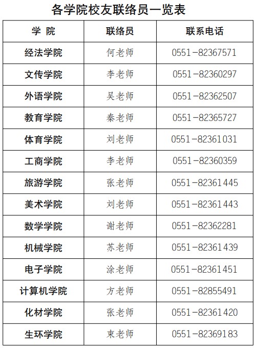 未尽事宜,请与校友工作办公室联系,联系人:郑老师、张老师,联系电话:0551-82361990、82361509;电子邮箱:xybgs@chu.edu.cn